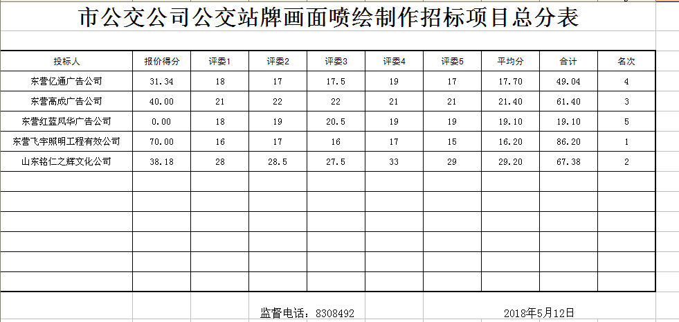 市公交公司公交站牌畫面噴繪制作招標項目總分表