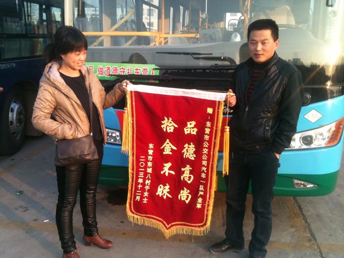 2013年12月5日,東城八村乘客于小梅女士拿著一面寫有“拾金不昧、品德高尚”的錦旗來到市公交公司汽車一隊(duì),感謝車隊(duì)嚴(yán)業(yè)軍師傅拾金不昧的高尚品德。