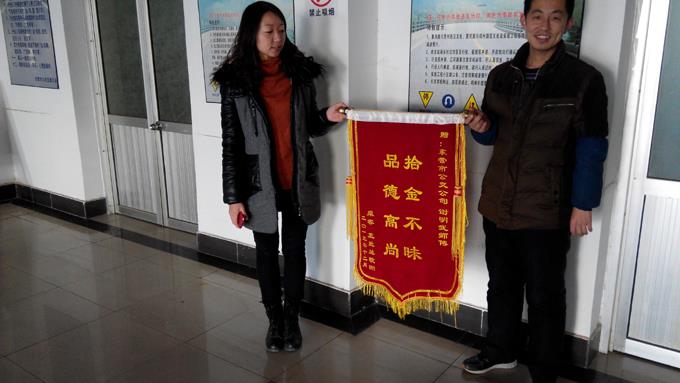 2014年1月23日,乘客王女士拿著一面寫有“拾金不昧,品德高尚”的錦旗來到市公交公司汽車一隊(duì),感謝車隊(duì)謝明武師傅的高尚品德。