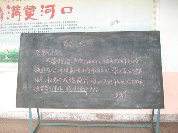 過(guò)去幾天的一場(chǎng)大雪,給車隊(duì)的安全生產(chǎn)帶來(lái)了很大的考驗(yàn),隨著路面上大部分積雪的融化,車輛已經(jīng)能夠基本正常運(yùn)行,但公交公司汽車三隊(duì)管理人員對(duì)安全工作絲毫不敢松懈,堅(jiān)持每天上路巡查車輛運(yùn)行情況和路面違章違紀(jì)情況,根據(jù)自身實(shí)際以敬告的形式將安全提示寫到黑板上,擺放在大廳門口,給駕駛員一個(gè)提醒,同時(shí)重點(diǎn)做好鄉(xiāng)鎮(zhèn)線路和個(gè)別駕駛員的安全叮囑工作,確保行車安全。