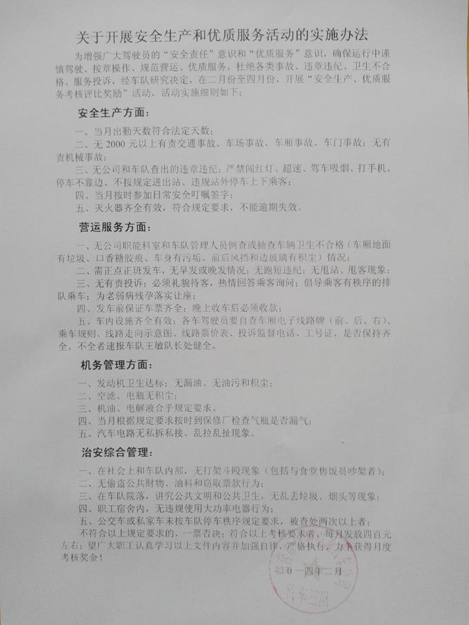 為增強廣大駕駛員的“安全責任”意識和“優(yōu)質(zhì)服務(wù)”意識,促使駕駛員出車前做好車輛檢查和衛(wèi)生保潔,運行中謹慎駕駛、優(yōu)質(zhì)服務(wù),收車后規(guī)范停車,減少各類違章違紀、服務(wù)投訴和行車事故,杜絕單車衛(wèi)生不合格和不收款現(xiàn)象發(fā)生,實現(xiàn)職工薪金跨年度平穩(wěn)過渡,市公交公司汽車三隊充分利用部分工資結(jié)余,發(fā)揮經(jīng)濟杠桿作用,自2014年2月份起制定實施了“安全生產(chǎn)和優(yōu)質(zhì)服務(wù)考評獎勵辦法”。