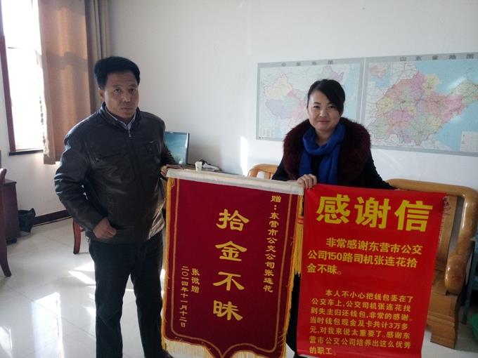 2014年11月12日,家住東營區(qū)錦繡龍軒小區(qū)的張微來到市公交公司汽車四隊,送來一面寫有“拾金不昧”的錦旗和感謝信,感謝車隊駕駛員張連花拾金不昧的高尚品德。