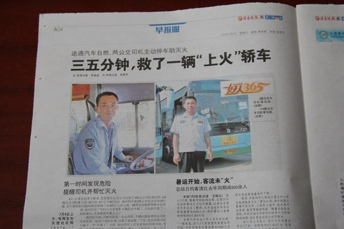 伸出援手的是公交公司3路車駕駛員商向陽和124路車駕駛員曹玉國,兩人齊表示,只是恰好路過看到伸出援手而已,都是應(yīng)該做的。商向陽介紹:“自燃轎車的司機是女性,當(dāng)時她都沒有發(fā)現(xiàn)引擎蓋冒濃煙,公交車底盤高,我一扭頭就看到了,當(dāng)時事發(fā)鬧市區(qū),萬一燃燒起來引發(fā)爆炸之類的就太危險了,于是我把公交車靠路邊停下,拎著滅火器就下來幫忙了?!辈苡駠?dāng)時駕駛著124路公交車看到這一幕,也緊跟著拎著滅火器下車幫忙?;饟錅绾?,兩位司機便回到公交車上開車離開了。