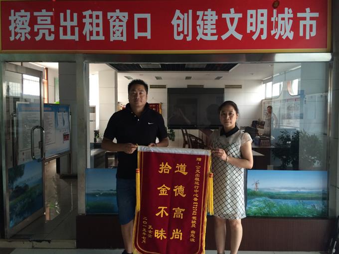 7月24日乘客孔女士乘坐魯ET2742出租車從燕山路到東城銀座,下車時不慎將10輛勝利油田貨運機動車登記證書及其他手續(xù)遺落在出租車上,因下車時孔女士未要出租車乘車票據,無法聯(lián)系該出租車駕駛員。 出租車駕駛員曲志波發(fā)現(xiàn)遺失物品后立即送到市公交公司出租運營中心,在運營中心的幫助下聯(lián)系上了孔女士,將遺失在出租車上的物品如數(shù)歸還,乘客為了表示對出租車駕駛員的感謝,于7月27日委托其丈夫送來錦旗一面。