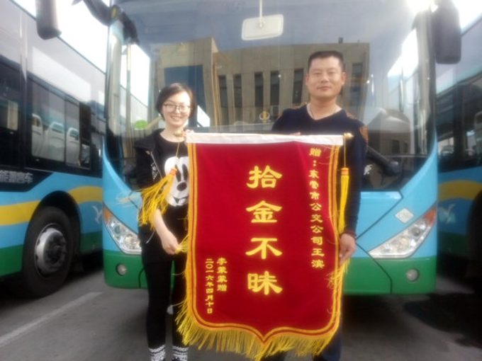 4月9日,在中心醫(yī)院上班的李蒙蒙女士來到市公交公司汽車四隊,送來一面寫有“拾金不昧”的錦旗,表揚駕駛員王濱。