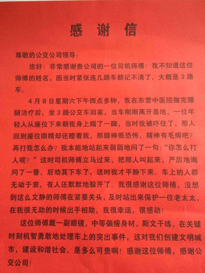 2017年4月18日下午,家住錦華四區(qū)的牟翠英老人拿著感謝信來(lái)到市公交公司汽車(chē)一隊(duì),感謝3路車(chē)駕駛員馬慶龍師傅見(jiàn)義勇為的高尚品德。據(jù)車(chē)隊(duì)了解得知,4月8日下午,牟翠英老人乘坐馬慶龍駕駛的從公交西站至公交公司的3路公交車(chē)回家,車(chē)輛行駛途中,一位年輕人朝牟翠英老人身上踹了一腳,回到座位后眼睛還瞪著牟翠英老人,牟翠英老人當(dāng)時(shí)很害怕。正在駕駛車(chē)輛的駕駛員馬慶龍發(fā)現(xiàn)后,在銀座購(gòu)物廣場(chǎng)站點(diǎn)停下車(chē),進(jìn)一步了解情況后,勸那位年輕人下了車(chē)。