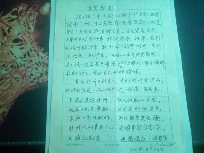 2018年6月24日上午,許女士拿著一件表?yè)P(yáng)稿來(lái)到市公交公司汽車一隊(duì),表?yè)P(yáng)121路駕駛員李團(tuán)兵師傅救助發(fā)病女乘客事跡。經(jīng)車隊(duì)了解得知,6月23日16:00時(shí)左右,汽車一隊(duì)駕駛員李團(tuán)兵駕駛魯E81658號(hào)車執(zhí)行火車站至公交公司的121路任務(wù)行經(jīng)區(qū)政府站點(diǎn)和理想之城站點(diǎn)間,車上有乘客告訴他,有人發(fā)生呼吸困難狀況。李團(tuán)兵趕緊將車停好,離開(kāi)駕駛座,發(fā)現(xiàn)一位女乘客發(fā)燒、臉色蒼白,然后給她送水,并打電話叫救護(hù)車。為了盡快讓該乘客得到救治,李團(tuán)兵與救護(hù)車上的工作人員說(shuō)明121路的運(yùn)行路線,然后駕駛車輛繼續(xù)行駛,在職業(yè)學(xué)院南門附近與救護(hù)車會(huì)合,把該乘客送上救護(hù)車。