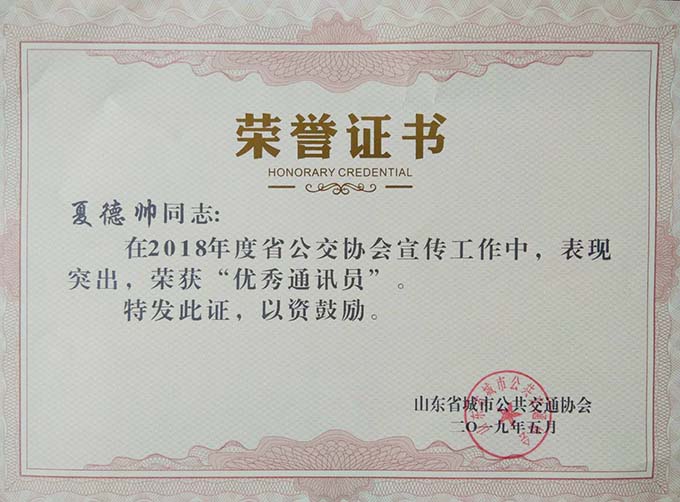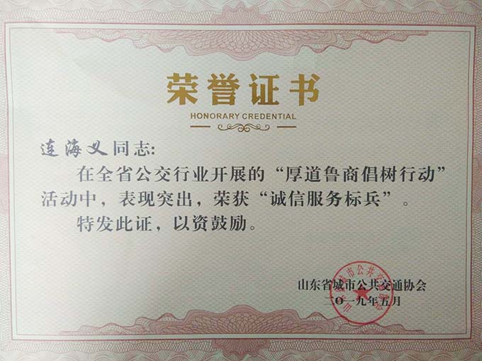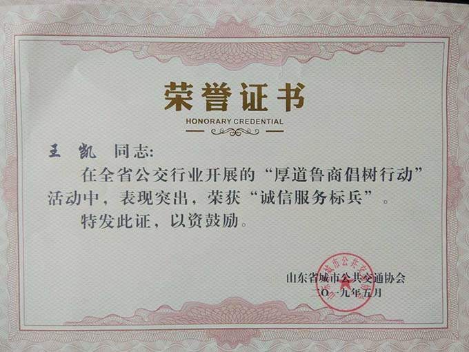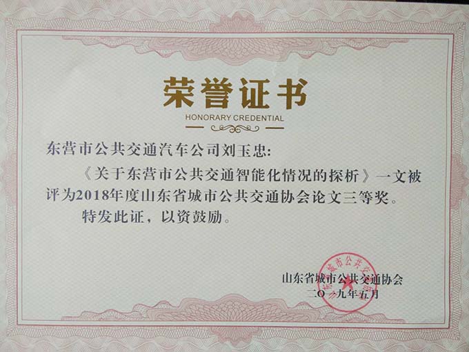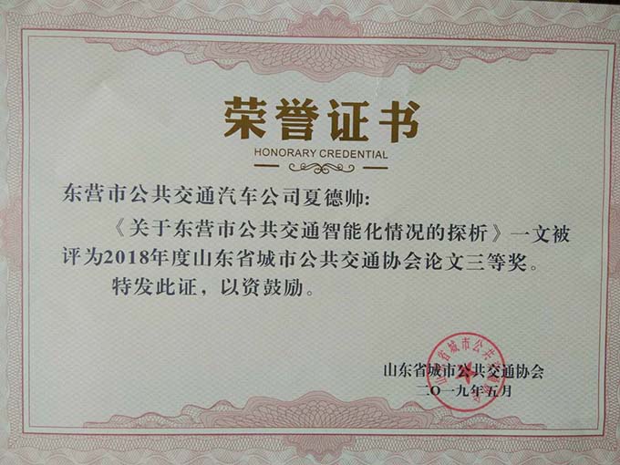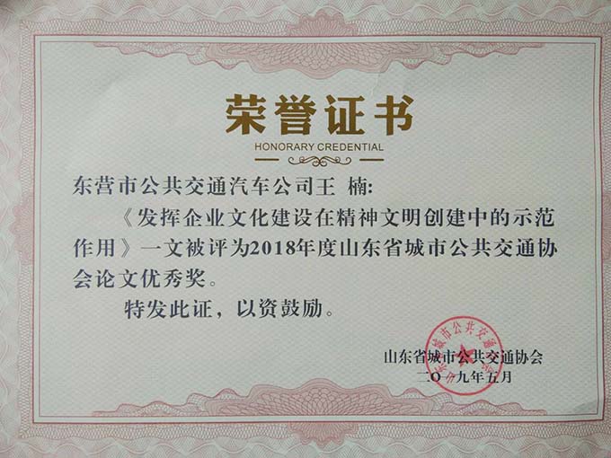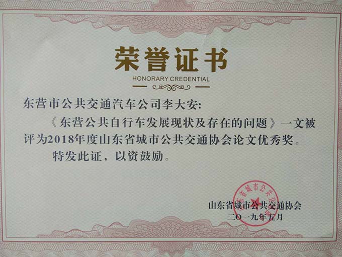 大會分別表彰了厚道魯商誠信公交企業(yè)、線路、標(biāo)兵及宣傳工作先進(jìn)單位、優(yōu)秀通訊員和優(yōu)秀研究成果論文。公司獲得山東省城市公共交通行業(yè)厚道魯商倡樹行動“誠信經(jīng)營企業(yè)”和山東省城市公共交通行業(yè)宣傳工作“先進(jìn)單位”榮譽稱號,9路車組獲得 “誠信公交線路”榮譽稱號,公司王凱、耿治建、連海義等三名同志獲得全省公交行業(yè)“誠信服務(wù)標(biāo)兵”榮譽稱號,夏德帥同志獲得全省公共交通行業(yè)“優(yōu)秀通訊員”榮譽稱號。由公司選送的《關(guān)于東營市公共交通智能化情況的探析》《發(fā)揮企業(yè)文化建設(shè)在精神文明創(chuàng)建中的示范作用》《東營公共自行車發(fā)展現(xiàn)狀及存在的問題》等3篇論文分別獲得三等獎1項,優(yōu)秀獎2項,并成功入選全省城市公共交通行業(yè)優(yōu)秀論文集。