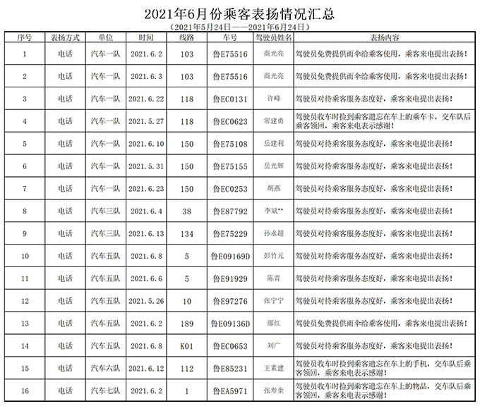 近段時(shí)間以來(lái),廣大駕駛員按照公司的部署,在做好疫情防控的同時(shí),積極投身公交服務(wù)質(zhì)量提升工作。經(jīng)過(guò)持續(xù)不斷的努力,公交服務(wù)質(zhì)量明顯提高,涌現(xiàn)了一大批的好人好事,受到乘客的好評(píng)。為繼續(xù)提高工作積極性,形成“比、學(xué)、趕、幫、超”的良好氛圍,現(xiàn)將2021年5月24日至2021年6月24日期間通過(guò)公交服務(wù)熱線(xiàn)受到乘客表?yè)P(yáng)的駕駛員予以通報(bào)。