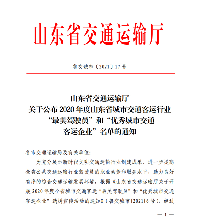 為充分展示新時代文明交通運(yùn)輸行業(yè)創(chuàng)建成果,進(jìn)一步提高全省公共交通運(yùn)輸行業(yè)駕駛員職業(yè)素養(yǎng)和服務(wù)水平,助力良好有序的綜合交通運(yùn)輸發(fā)展環(huán)境,根據(jù)《山東省交通運(yùn)輸廳關(guān)于開展2020年度全省城市交通客運(yùn)“最美駕駛員”和“優(yōu)秀城市交通客運(yùn)企業(yè)”選樹宣傳活動的通知》(魯交城市〔2021〕6號)要求,經(jīng)活動啟動、材料申報、資格審查、公開公示、人選推薦、專家評審等環(huán)節(jié),產(chǎn)生了優(yōu)秀城市交通客運(yùn)企業(yè)和城市交通客運(yùn)最美駕駛員名單,市公交公司及兩名駕駛員榜上有名。