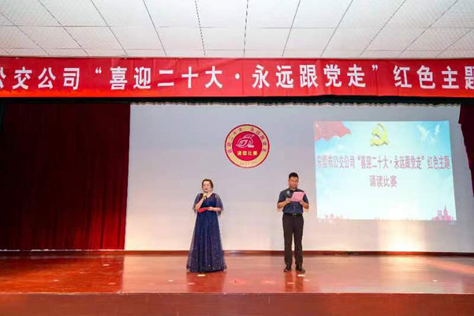 為迎接黨的二十大勝利召開,更加深入學習貫徹省十二次黨代會精神,集中展現(xiàn)新時期公交干部職工在各自工作崗位上的新作為、新?lián)?、新姿態(tài),引導(dǎo)公司干部職工更加堅定理想信念,在“七一”建黨節(jié)來臨之際,市公交公司于6月30日上午組織開展了“喜迎二十大·永遠跟黨走”紅色主題誦讀比賽活動。市交通運輸局直屬機關(guān)黨委專職副書記趙秀來同志到場指導(dǎo),市公交公司黨委委員、工會主席蔣積堯,黨委委員、辦公室主任劉玉忠等出席活動。