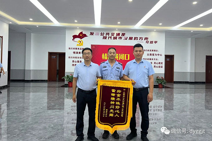 失主家屬杜先生趕做一面“拾金不昧好心人,雷鋒精神閃光輝”的錦旗,驅(qū)車來(lái)到車隊(duì)表達(dá)謝意。