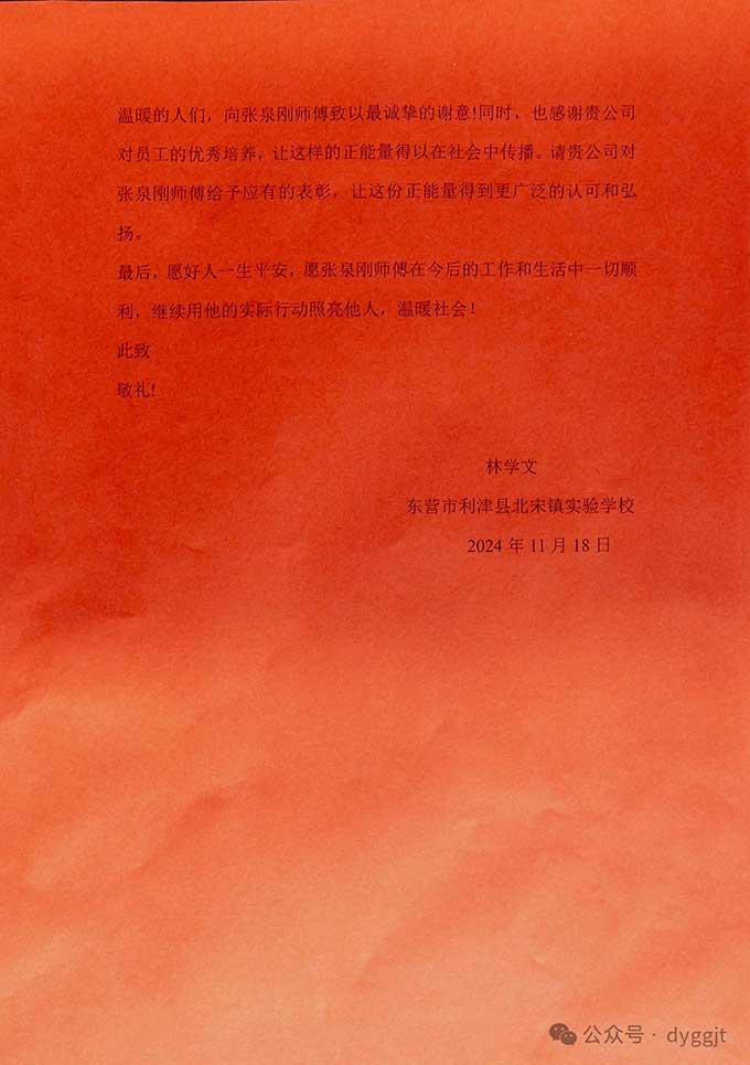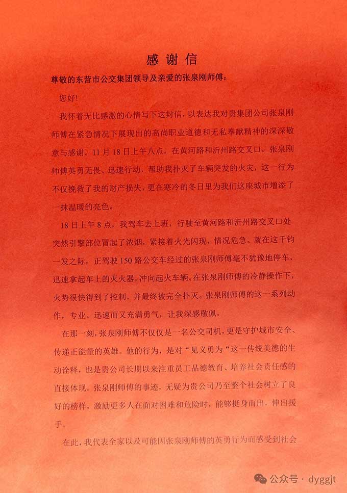 車主林先生特意寫(xiě)來(lái)一封感謝信并制作了一面錦旗表達(dá)謝意,字里行間充滿了對(duì)張泉?jiǎng)値煾档母屑ぶ?。他在信中提到,張泉?jiǎng)値煾档男袨樵缫殉搅斯获{駛員的基本職責(zé)范疇,堪稱守護(hù)城市安全衛(wèi)士和傳遞正能量的楷模一點(diǎn)也不為過(guò)。他用實(shí)際行動(dòng)生動(dòng)詮釋了“見(jiàn)義勇為”這一中華民族的傳統(tǒng)美德,同時(shí)也彰顯了東營(yíng)市公交集團(tuán)在職工品德教育方面的卓越成效,以及對(duì)培養(yǎng)職工社會(huì)責(zé)任感的高度重視。