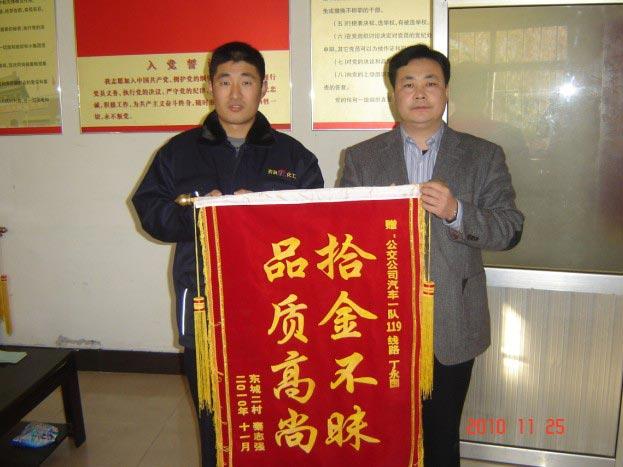 11月25日上午,齊潤化工廠的秦志強(qiáng)先生拿著一面寫有“拾金不昧、品質(zhì)高尚”的錦旗來到市公交公司汽車一隊(duì),感謝119路駕駛員丁永國師傅拾金不昧的高尚品德。據(jù)車隊(duì)了解得知,11月24日,秦先生的母親在齊潤化工廠丁莊駐地領(lǐng)取完1000元的“孝心取暖費(fèi)”后,乘坐119路返回東城,回家后發(fā)現(xiàn)現(xiàn)金不見了,抱著試試看的想法來到汽車一隊(duì)詢問得知,駕駛員丁永國師傅已將現(xiàn)金1029元上繳車隊(duì)等待失主認(rèn)領(lǐng)。秦先生告訴車隊(duì)領(lǐng)導(dǎo),他的母親患有高血壓病史,現(xiàn)金丟失后老人心急如焚,當(dāng)時(shí)就癱坐在車隊(duì)辦公室內(nèi),幸虧車隊(duì)的田隊(duì)長熱情接待,及時(shí)核對(duì)情況后,將錢物如數(shù)歸還并將老人安全地送到回家的車上。