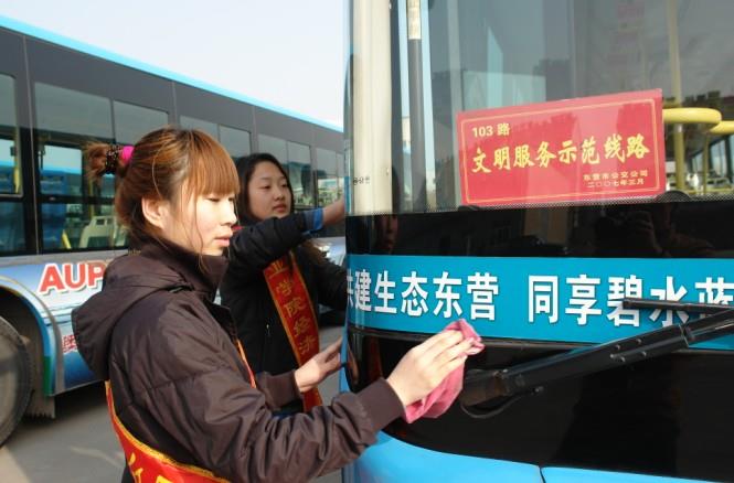 來自東營(yíng)市職業(yè)學(xué)院經(jīng)濟(jì)系的大學(xué)生和汽車一隊(duì)職工共計(jì)30余人,分成六個(gè)小組,上午幫助駕駛員擦拭車身,打掃車廂,下午乘坐公交車為特需乘客服務(wù)。