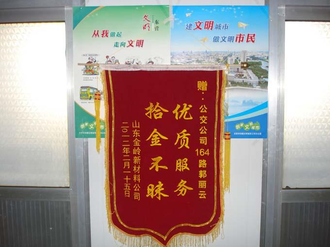 這位小伙子名叫燕同意,是山東金嶺新材料公司的一名職工,2012年2月15日上午,剛下了早班的燕同意乘坐8:40的164路返回東城,下車時將錢包落在了公交車上。跑回東城的駕駛員郭麗云在打掃車輛衛(wèi)生時看到了一個棕色的牛皮錢包,里面3000多元現(xiàn)金,4張銀行卡,1張銀聯(lián)卡,1張身份證。面對鼓鼓的錢包,郭麗云第一時間將錢包交到了車隊。并與車隊工作人員一起通過包內(nèi)的卡片多方聯(lián)系,在短短不到半個小時內(nèi)便將錢包送到了失主的手中。小燕問駕駛員名字,郭麗云卻怎么也不肯告訴他。小燕通過多方打聽才知道了她的姓名。時隔多日,小燕帶著感激的心情送來了一面寫有“優(yōu)質(zhì)服務(wù)、拾金不昧”的錦旗。
