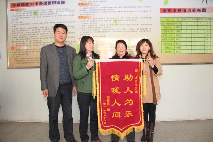 3月20日早上8:30分,一位年邁花甲的周阿姨在家人的陪伴下來(lái)到市公交公司信息中心IC卡業(yè)務(wù)辦理處,送來(lái)一面“情暖人間,助人為樂(lè)”的錦旗,以此來(lái)感謝市公交公司IC卡業(yè)務(wù)辦理處職工耿瑞華及王海紅尊老愛(ài)幼、助人為樂(lè)的優(yōu)良品質(zhì)。