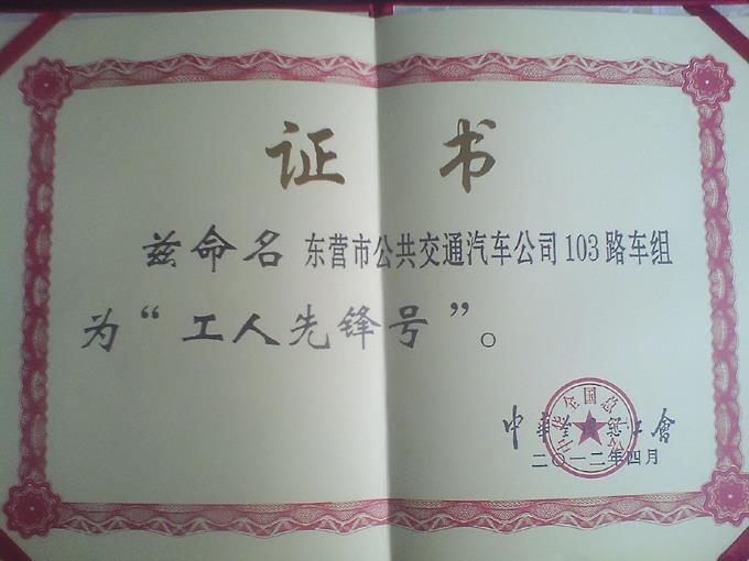 近年來,市公交公司103路車組人員把優(yōu)質(zhì)服務(wù)作為積極奉獻(xiàn)的目標(biāo),視乘客為親人,愛崗敬業(yè),無私奉獻(xiàn),出色地完成了各項(xiàng)營運(yùn)生產(chǎn)任務(wù),得到了廣大乘客的一致好評,被親切地稱之為“滿意車”、“放心車”、“安全車”。并先后獲得山東省城建行業(yè)“文明服務(wù)標(biāo)兵”、東營市五一勞動(dòng)獎(jiǎng)?wù)?、東營市“十佳服務(wù)標(biāo)兵”、“市級工人先鋒號”、市文明委授予的“全市十佳文明示范窗口”、省總工會授予的“山東省工人先鋒號”等多項(xiàng)榮譽(yù)稱號,展示了公交駕駛員良好的精神風(fēng)貌,營造了和諧文明的社會氛圍。